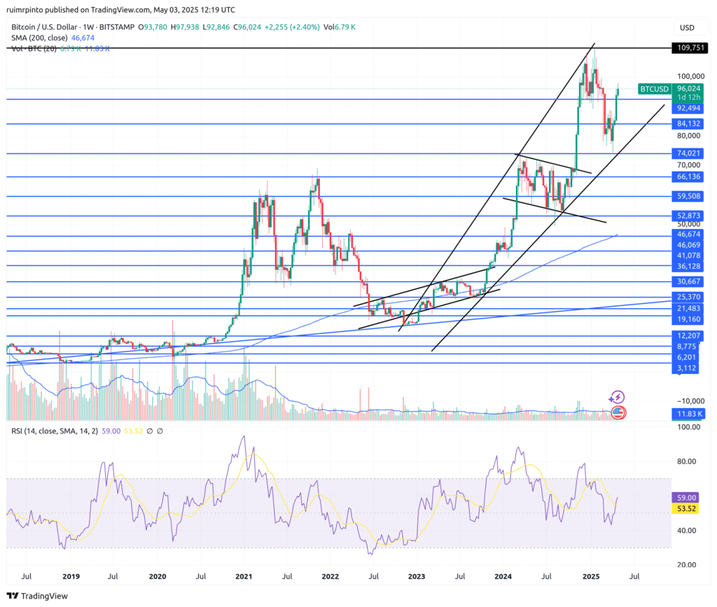Bitcoin accompanied stocks on the way up, and gained 2.4% this week. It is now around 96k$. The key resistance and support levels on Bitcoin, for the short term, are 109k$ and 92k$, respectively.