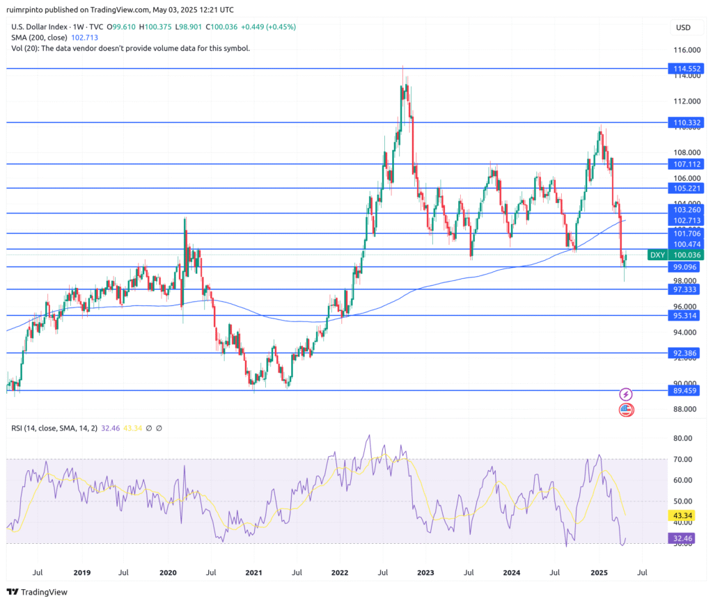 The relative strength of the US dollar (DXY) rose slightly (by 0.45%) during the week but closed essentially unchanged relative to the previous period, at ~100. A weaker dollar may help the US to improve the competitiveness of their exports. The EUR/USD is around 1.129$, the GBP/USD is at 1.327$, and the USD/JPY is at 144.98 JPY.