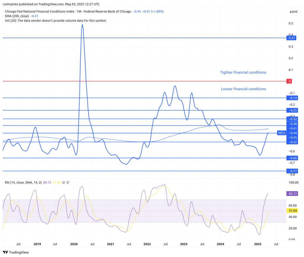 The national financial conditions index (NFCI) released on the 21st April 2025 tightened by 1.9%. Note that this indicator is delayed by two weeks.