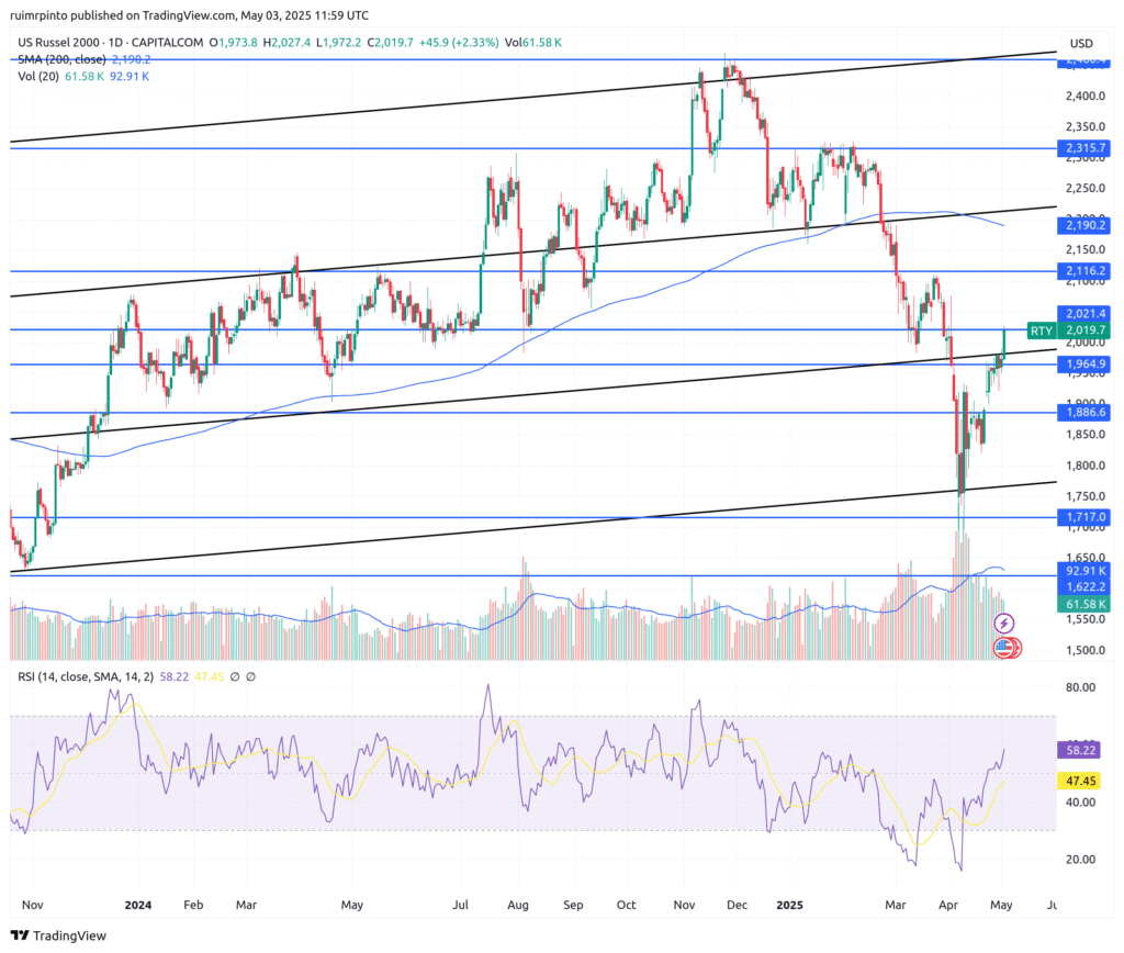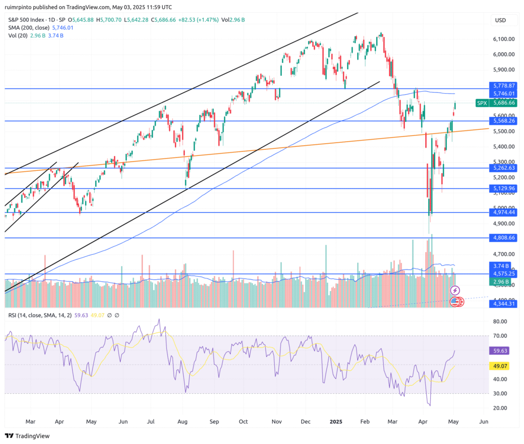 This week the S&P500 and the NASDAQ 100 continued recovering and rose by 2.9% and 3.5%, respectively. On the way up, the S&P may encounter resistance around ~5650. The small cap index (Russel 2000) was up by 3.3%. Trading volumes were average.