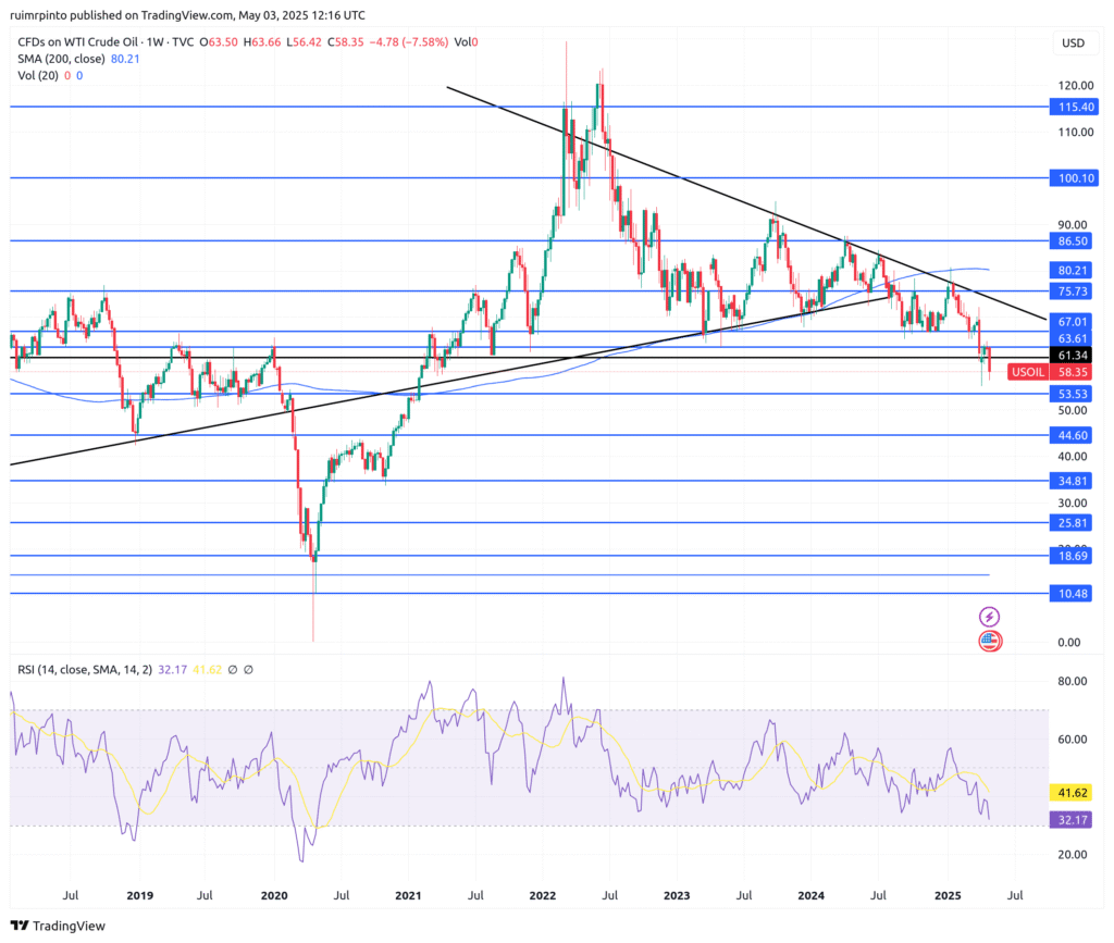 WTI crude oil fell by 7.6% and closed the week at 58.3$/bbl. If it continues falling (the most likely scenario), the next support level is around 54$. On the upside, 62-64$ will likely offer resistance.