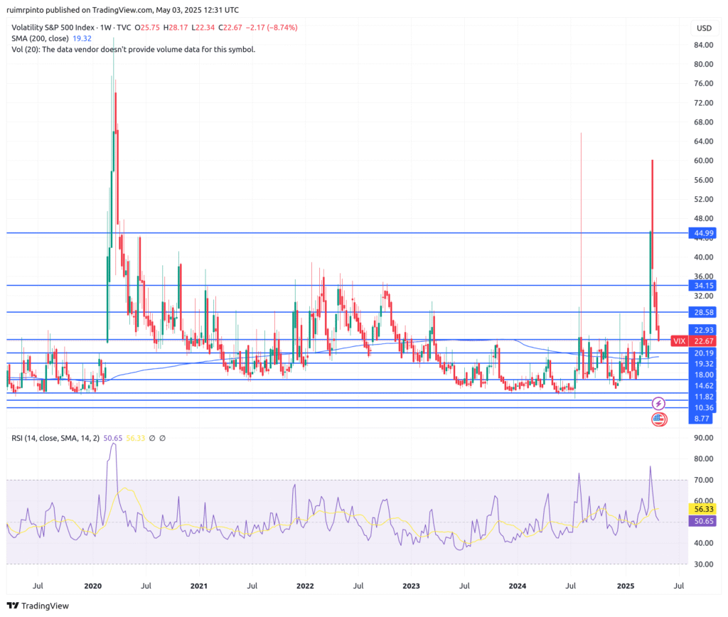 The VIX closed the week at ~23, showing a decreasing risk perception in the options market. Soon, we will enter again into complacency territory. In our opinion, the overall systemic risk in the stock market and uncertainty about the US economy is too high to be fully allocated to stocks on the long side. At this point, we wouldn’t recommend selling puts unless you are really comfortable buying the underlying asset (cash-secured puts)!