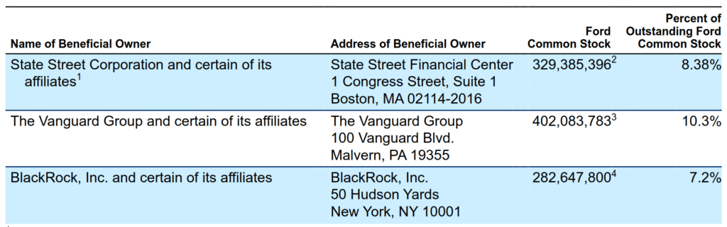 Pursuant to SEC filings, Ford was notified that as of December 31, 2024, the entities included in the table below had more than a 5% ownership interest of Ford common stock, or owned securities convertible into more than 5% ownership of Ford common stock, or owned a combination of Ford common stock and securities convertible into Ford common stock that could result in more than 5% ownership of Ford common stock.