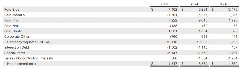 “The year-over-year increase of $1,532 million in net income/(loss) in 2024 was primarily driven by lower special items and higher Ford Pro EBIT, offset partially by lower Ford Blue EBIT and higher taxes. The lower year-over-year special items primarily reflect the non-recurrence of a pension and OPEB remeasurement loss in 2023, a pension remeasurement gain in 2024, and lower year-over-year restructuring related charges, offset partially by expenses related to the three-row SUV EV program cancellation. The year-over-year decrease of $208 million in Company adjusted EBIT primarily reflects lower Ford Blue and Model e EBIT, offset partially by higher Ford Pro EBIT and Ford Credit EBT.”