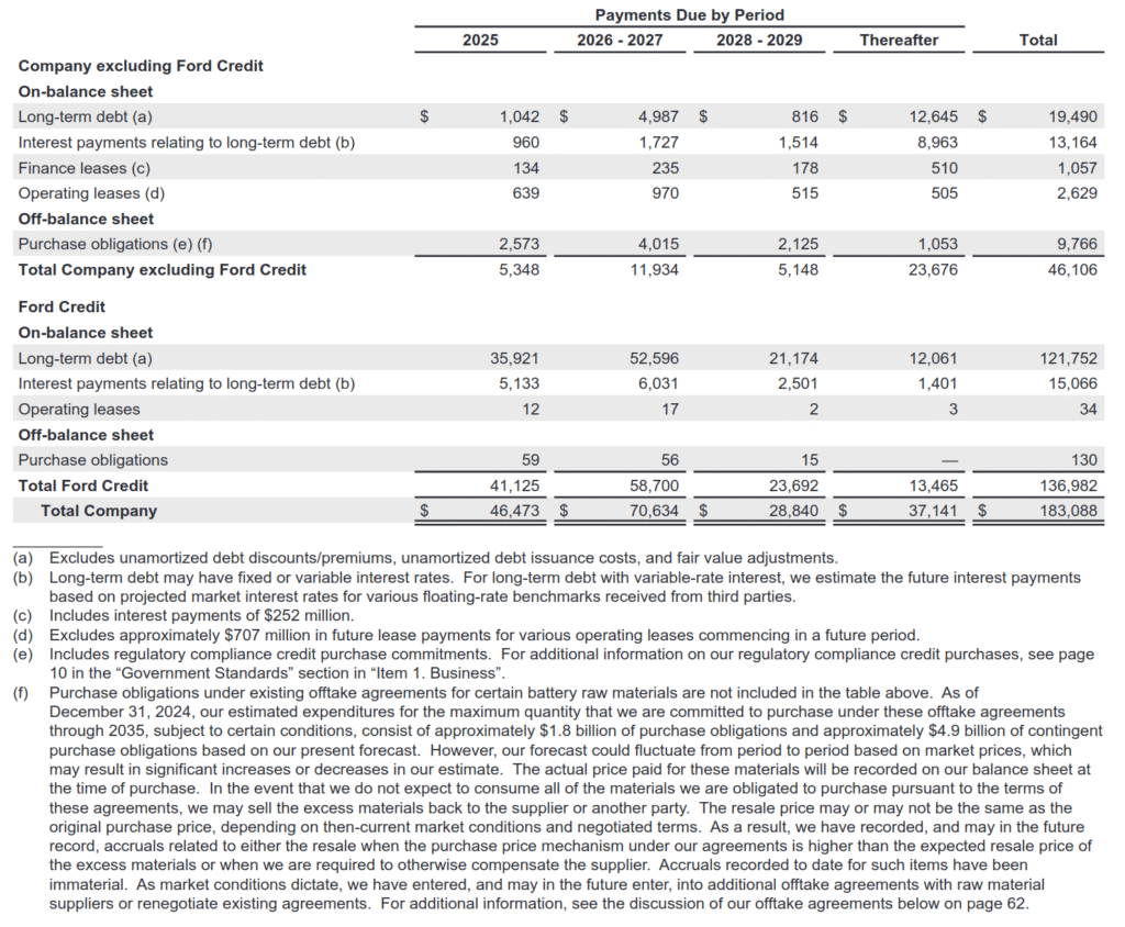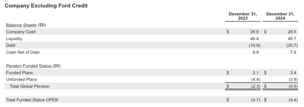 At December 31, 2024, Ford had a cash position of $28.5 billion and liquidity of $46.7 billion. At December 31, 2024, about 88% of Company cash was held by consolidated entities domiciled in the United States. To be prepared for an economic downturn and other stress scenarios, Ford targets an ongoing cash balance at or above $20 billion plus significant additional liquidity above the Company cash target.