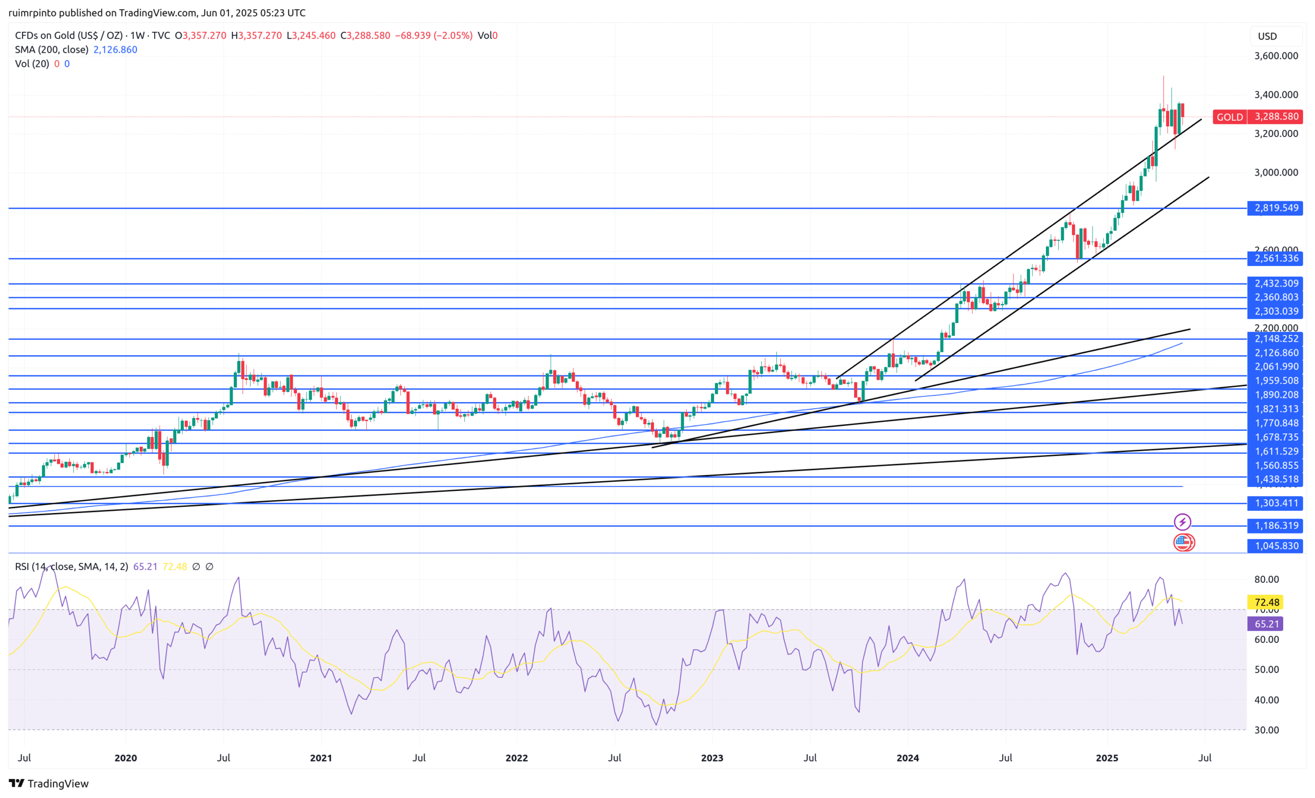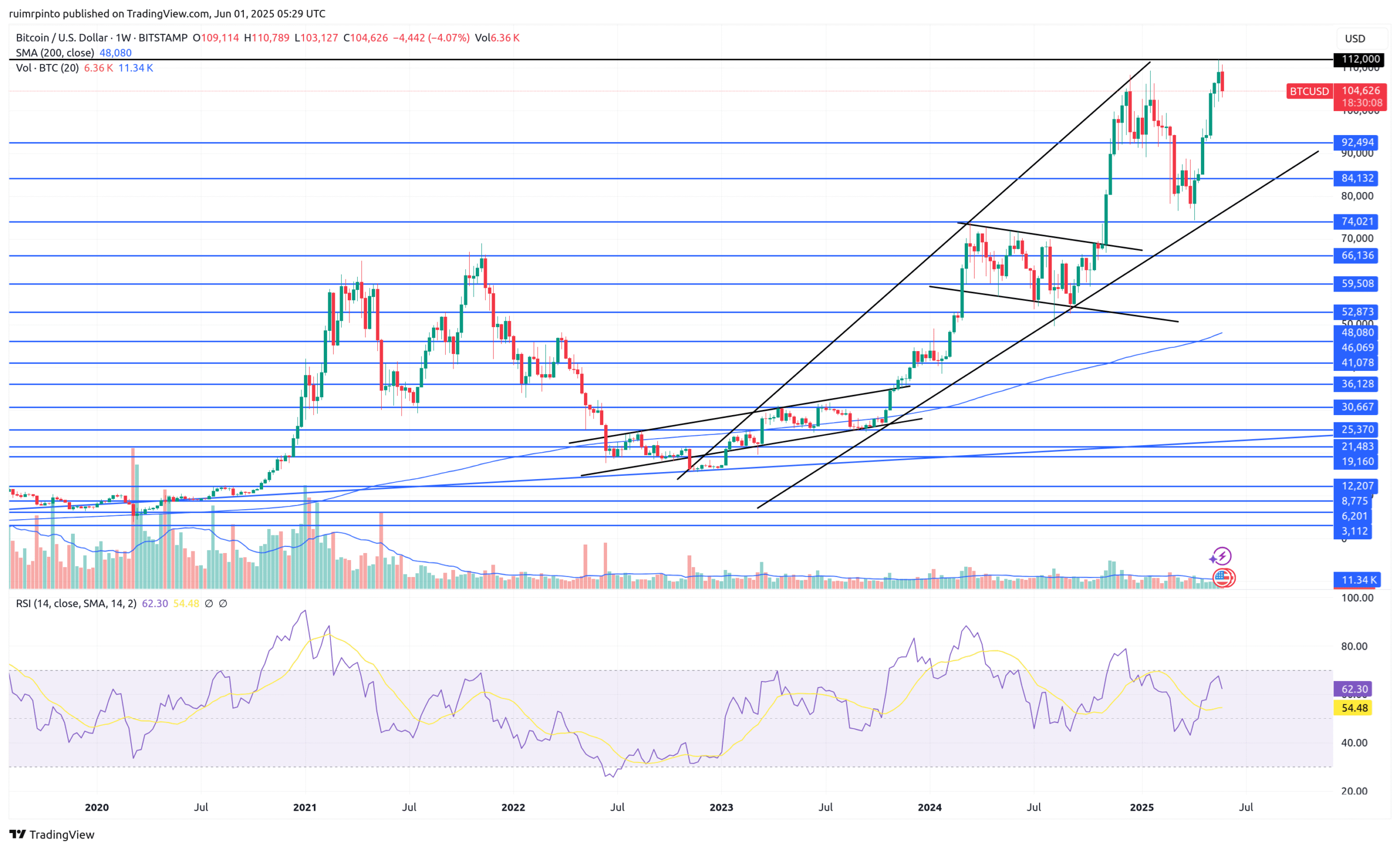 Bitcoin corrected 4.1% after reaching a new all-time-high last week (112k$). If it continues falling, the next target is likely around 102k$. For the next weeks, the key resistance and support levels on Bitcoin, are 112k$ and 92k$, respectively.
