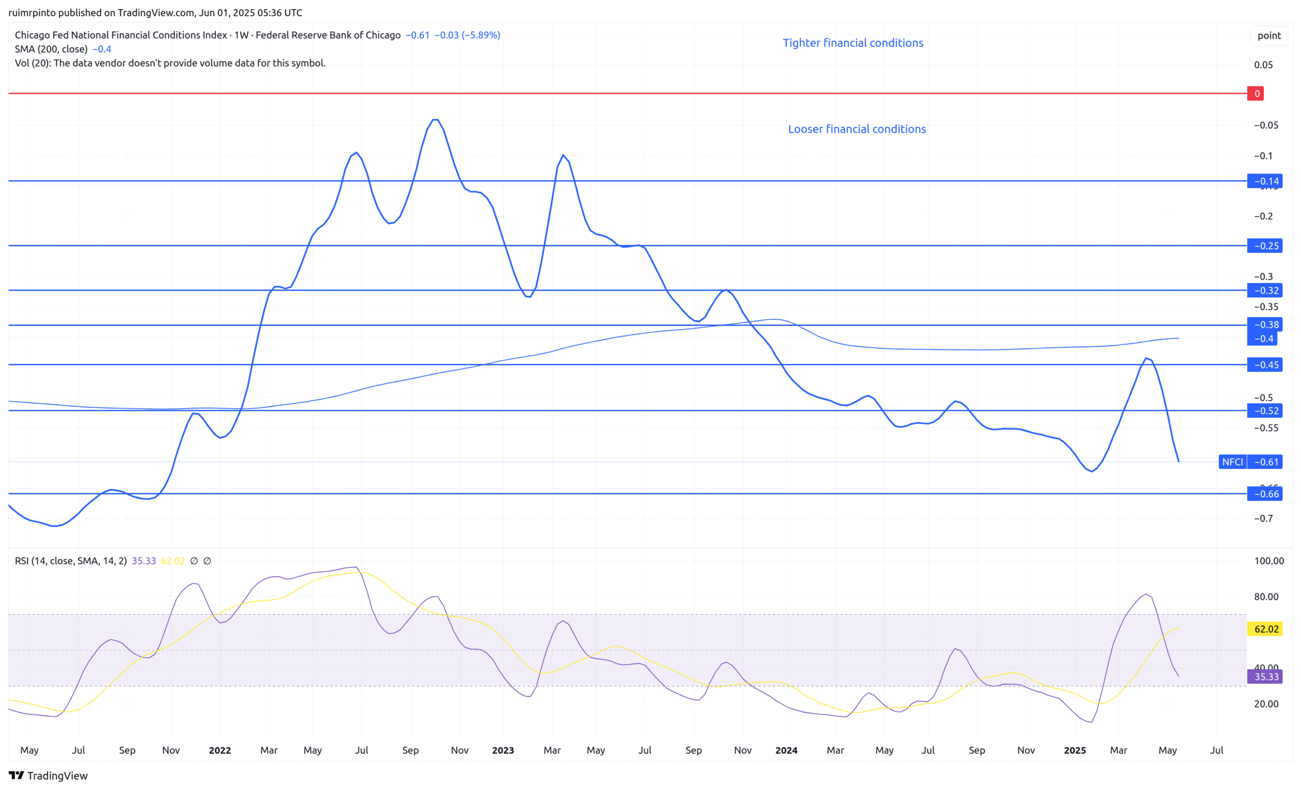The national financial conditions index (NFCI) released on 19th May 2025 loosened by 5.9%. Note that this indicator is delayed by two weeks. Positive numbers in the NFCI mean tighter financial conditions, while negative numbers indicate looser financial conditions.