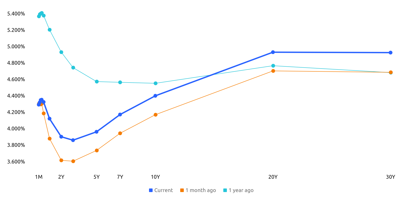 US bond yields fell slightly this week. Yields now sit at 3.900% for the 2-year and 4.398% for the 10-year. As you can see, the yield curve has uninverted since a year ago, and lower yields are expected in the next few years, likely as a consequence of a recession and interest rate cuts. However, long-term growth and inflation expectations are about 5%.