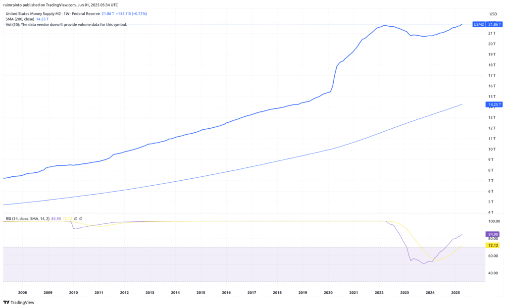 US M2 money supply at the date of 28th April 2025 was up by 0.72%, showing a slow increase over the previous month – credit institutions didn’t stop lending so far. If the money supply was going down, it would be another warning sign for the economy and equities.