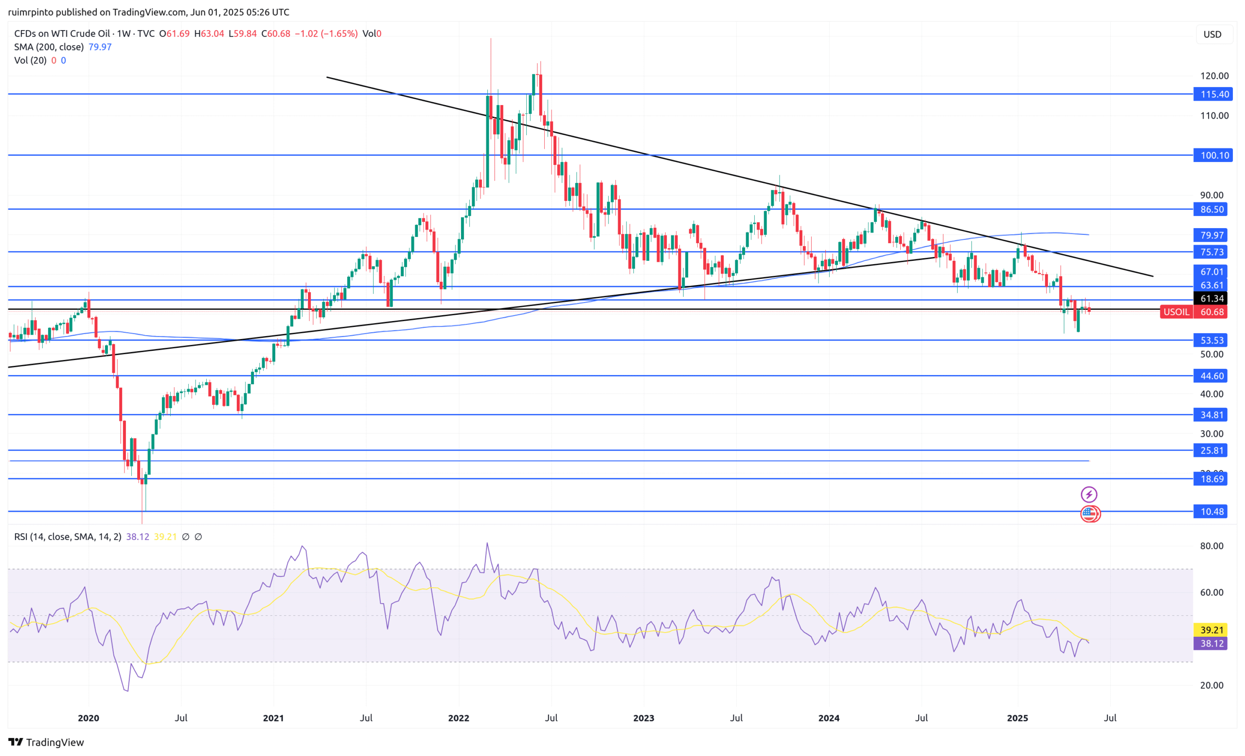 WTI crude oil fell slightly this week, closing at 60.7$/bbl. The trading range in the near future seems to be 54-64$/bbl, but oil may be subject to large swings due to wider macroeconomic developments or major oil producer announcements.