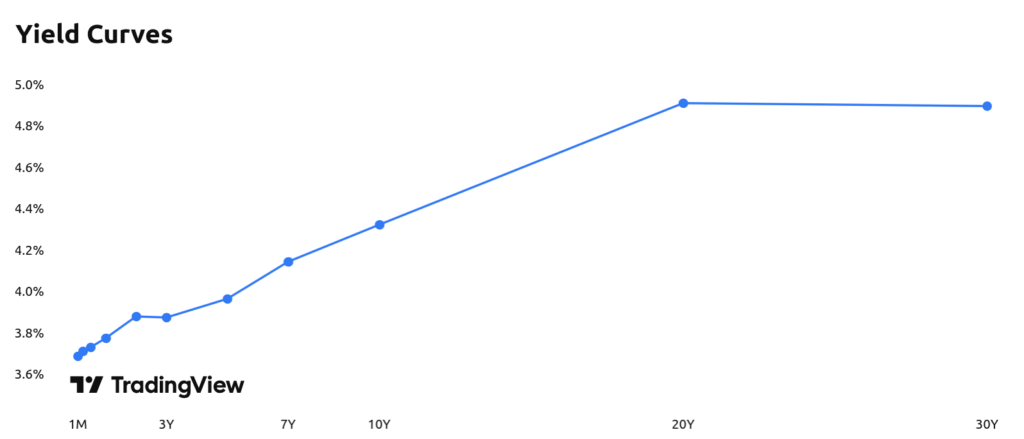 The yield curve shows the relationship between interest rates (yields) and time to maturity for government bonds—typically U.S. Treasuries.
